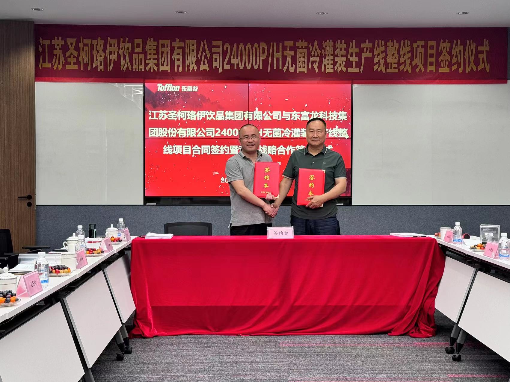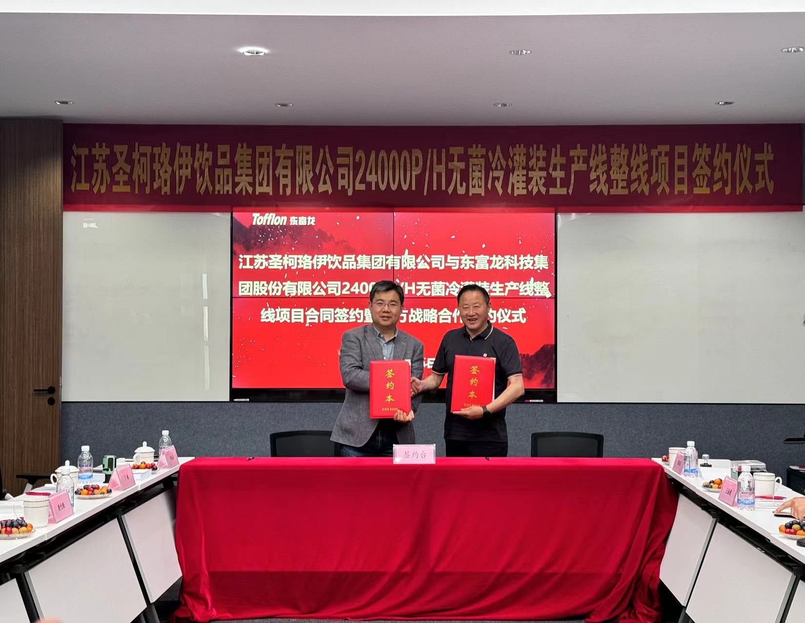 近期,江蘇圣柯珞伊飲品集團有限公司張董、趙董、王總一行帶隊赴東富龍東臺工廠考察交流,并與東富龍食品工程在東臺工廠舉行戰(zhàn)略合作簽約儀式。