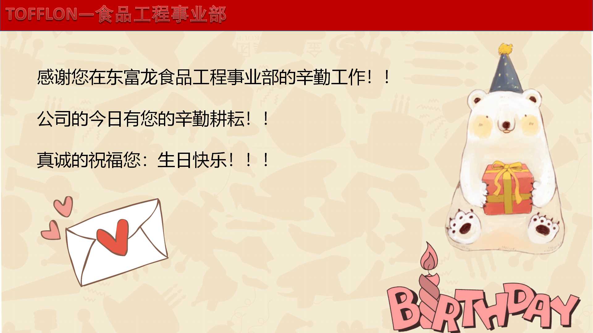 本次員工生日會的成功舉辦,也是公司致力于豐富員工業余生活、更加關愛員工的開始,相信在接下來的日子里,在東富龍食品事業部全體員工的共同努力下,一定會為公司營造一個團結協作、和諧融洽、積極向上、充滿斗志的工作氛圍,讓公司在未來的歲月里更創輝煌!