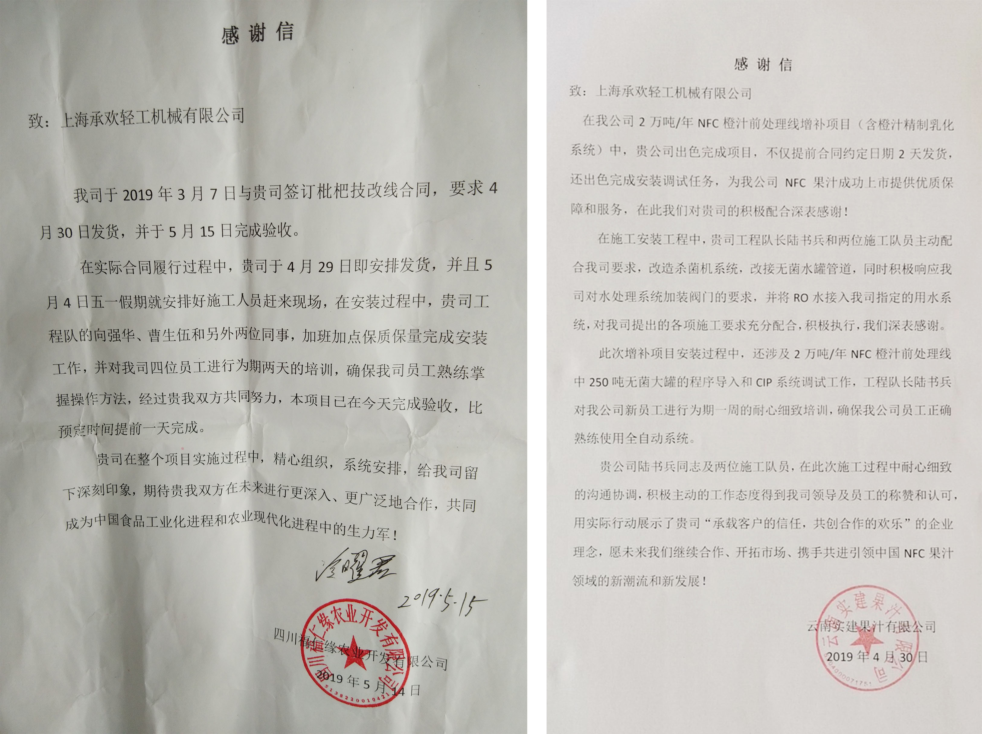 在半個月的時間里,我司相繼收到云南實建果汁有限公司、四川福仁緣農(nóng)業(yè)開發(fā)有限公司發(fā)來的感謝信,在信中,就我司所承建項目中的產(chǎn)品設(shè)備和技術(shù)服務(wù),給出了較高的評價和認可。同時也對我司在一線的工作人員給予了很高的評價。